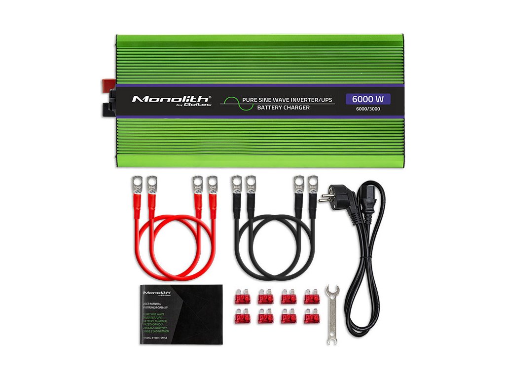 Obsah soupravy: | 1 x invertor 8 x pojistka 1 x sada vodičů 1 x klíč pro zapojení 1 x napájecí kabel 1 x záruční list 1 x uživatelská příručka |
