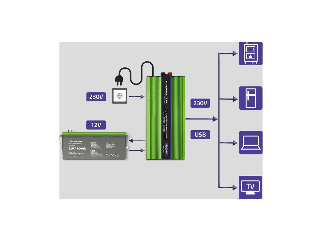 - měnič napětí 12 V na 230 V , po připojení baterie měnič odebírá energii potřebnou k napájení připojeného zařízení,