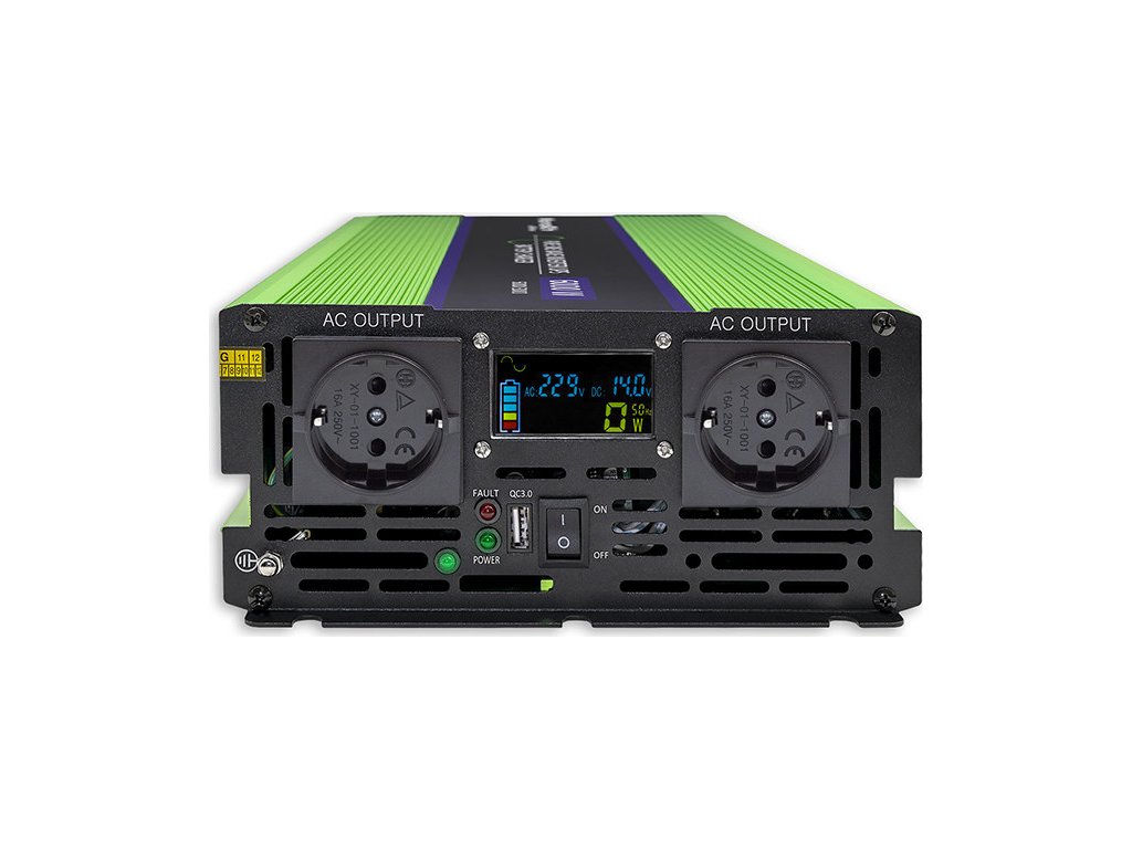 Střídač je vybaven LCD displejem , který nás informuje o aktuálním stavu baterie, výkonu připojených zařízení a střídavém a stejnosměrném napětí. Můžete sledovat provozní parametry zařízení, díky čemuž je práce s měničem jednoduchá, bezpečná a spolehlivá.