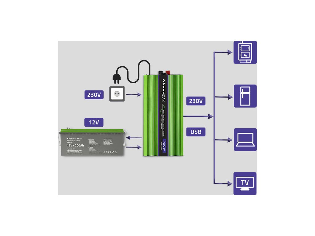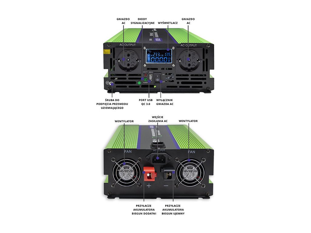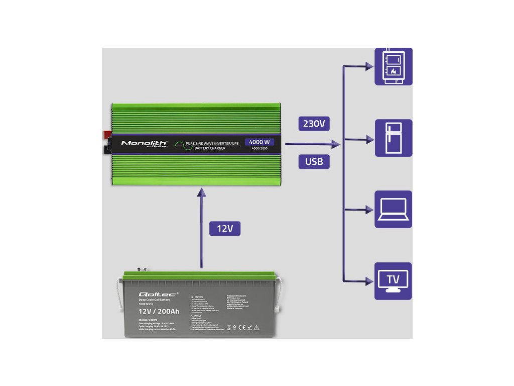 Invertor Qoltec je čistý sinus , produkuje stejný proud jako v zásuvce 230V , čímž zajišťuje bezpečnost všech připojených zařízení. Skvělá bude jak při výpadku proudu , tak i při cestování , když nemáme přístup k zásuvce.