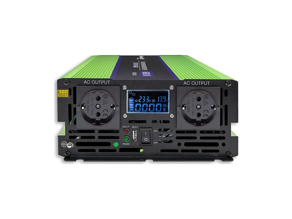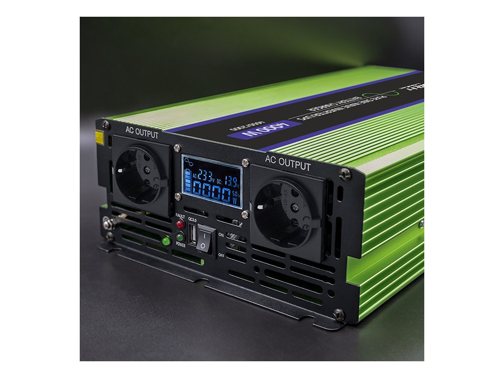 Střídač je vybaven LCD displejem , který nás informuje o aktuálním stavu baterie, výkonu připojených zařízení a střídavém a stejnosměrném napětí. Můžete sledovat provozní parametry zařízení, díky čemuž je práce s měničem jednoduchá, bezpečná a spolehlivá.