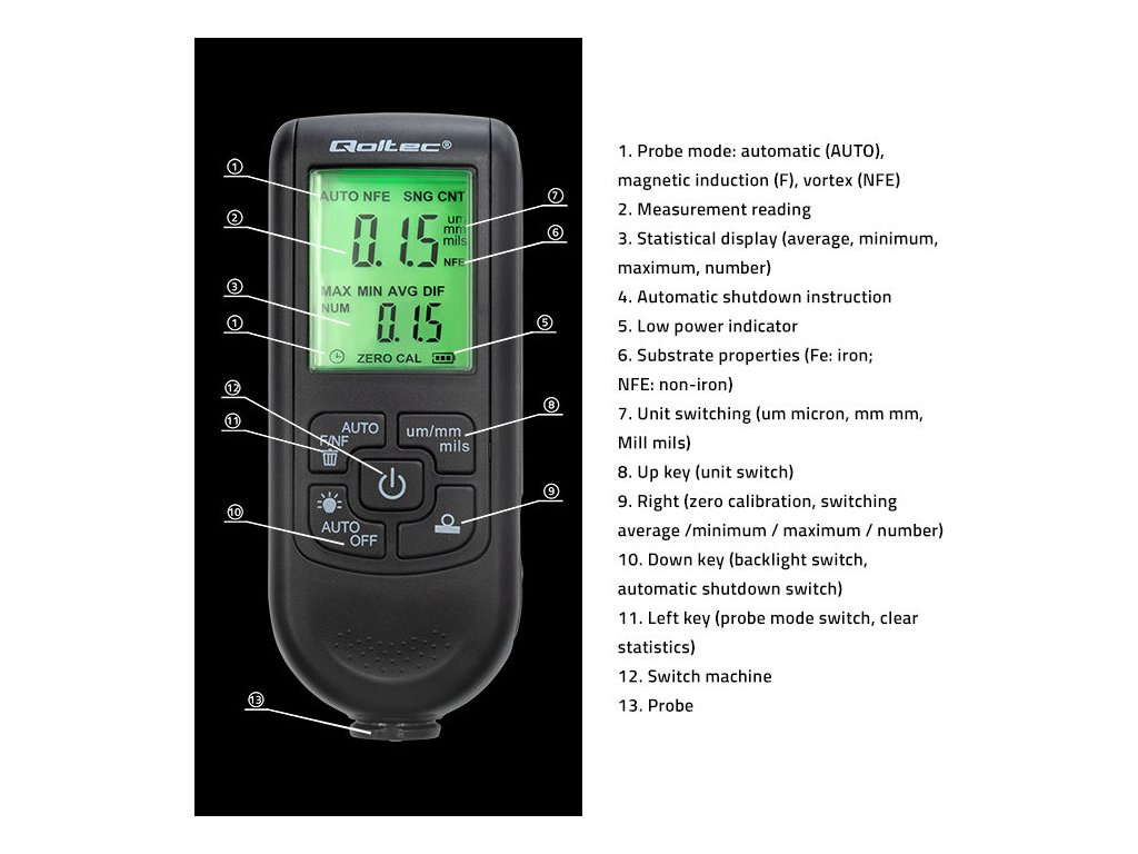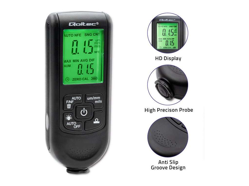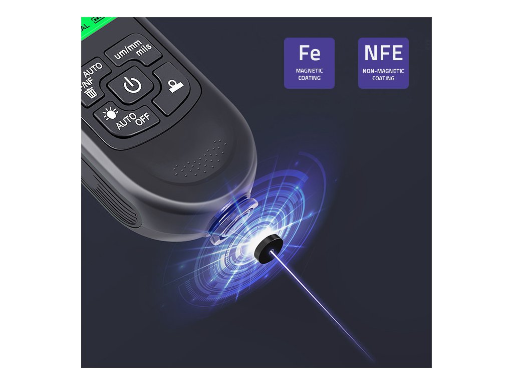- Tři režimy sondy : automatický režim (AUTO), režim magnetické indukce (F) a vířivý režim (NFE),