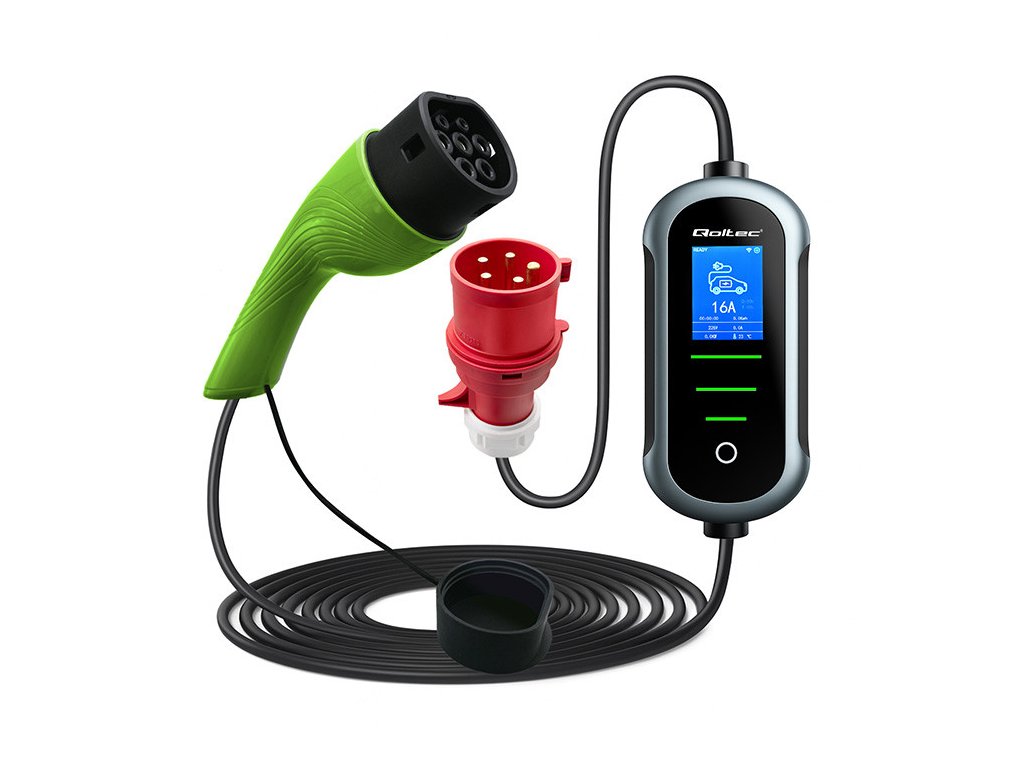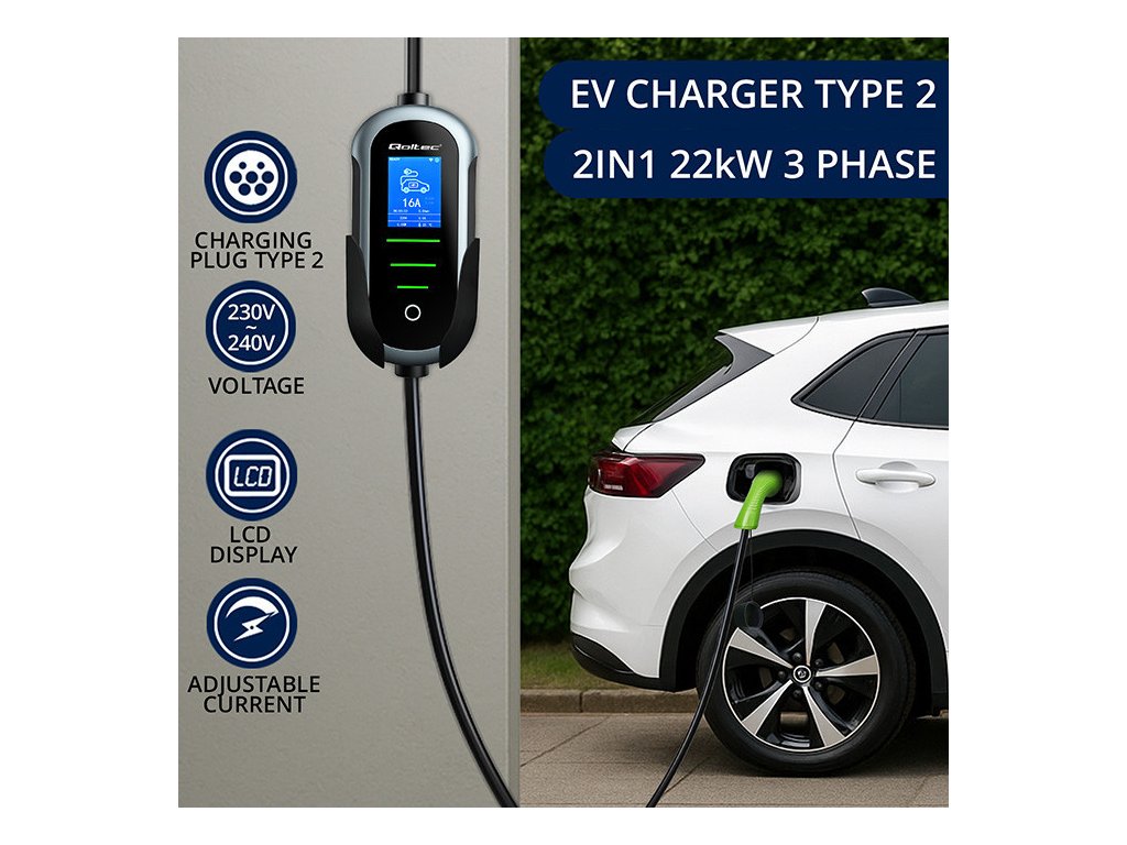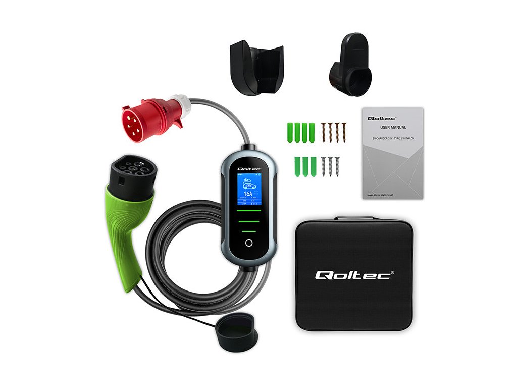 Mobilní nabíječka Qoltec pro elektromobily s regulací 2 v 1 Typ2 | 22kW | 400V | Wi-Fi | TUYA | SMART LIFE | LCD | Přenosná | Wallbox | 7m