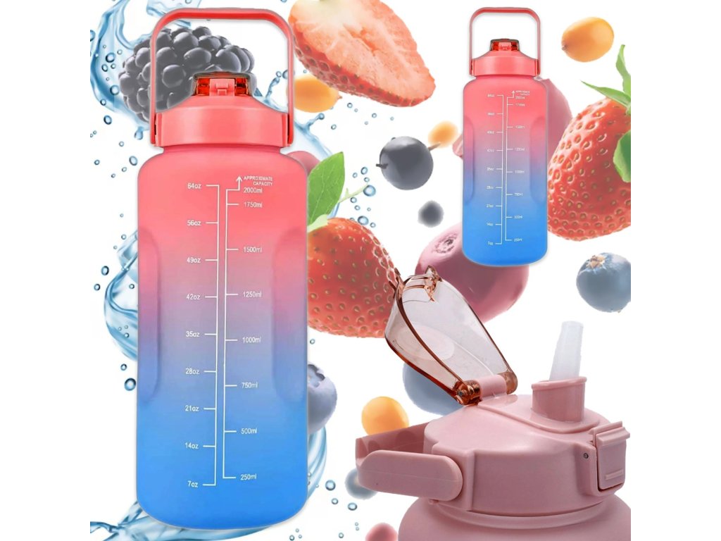 Láhev o objemu 2000 ml umožňuje delší použití bez nutnosti častého doplňování. Ideální pro intenzivní trénink, dlouhé výlety nebo celý den v práci nebo ve škole. Láhev na vodu s brčkem s uchem odměrky je díky své velké kapacitě dokonalým řešením pro zajištění dostatečné hydratace po celý den.