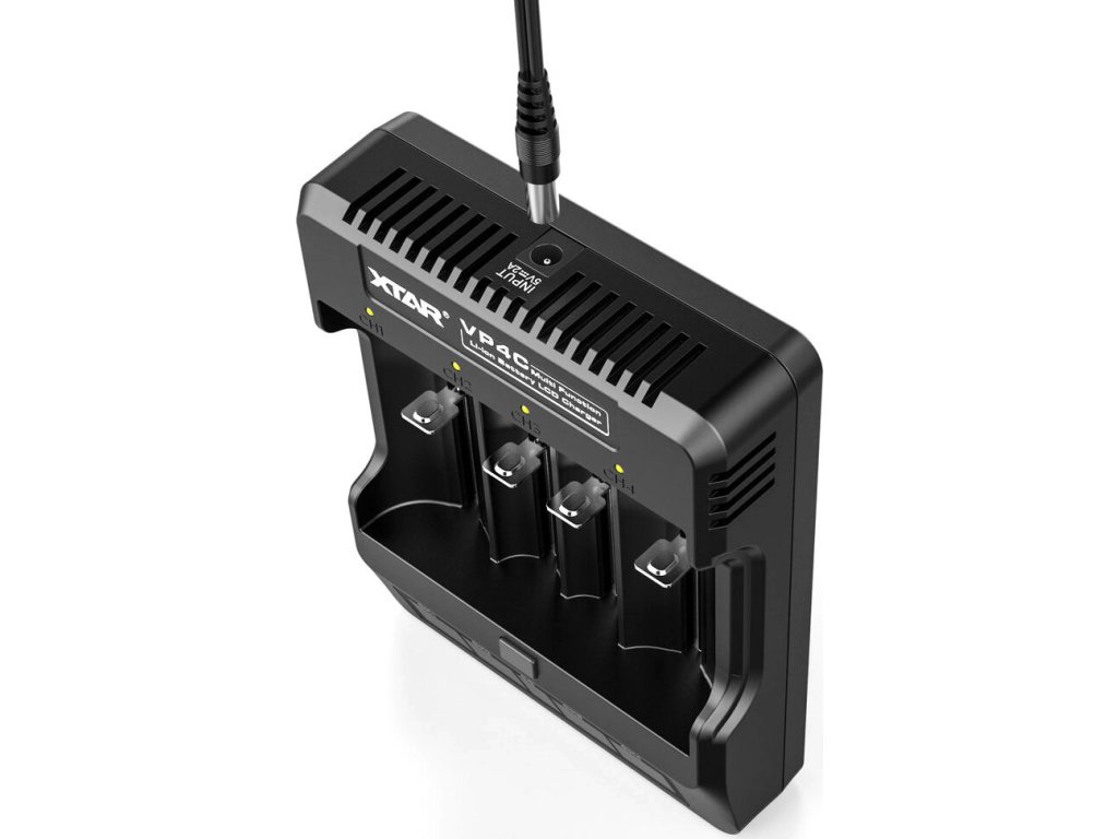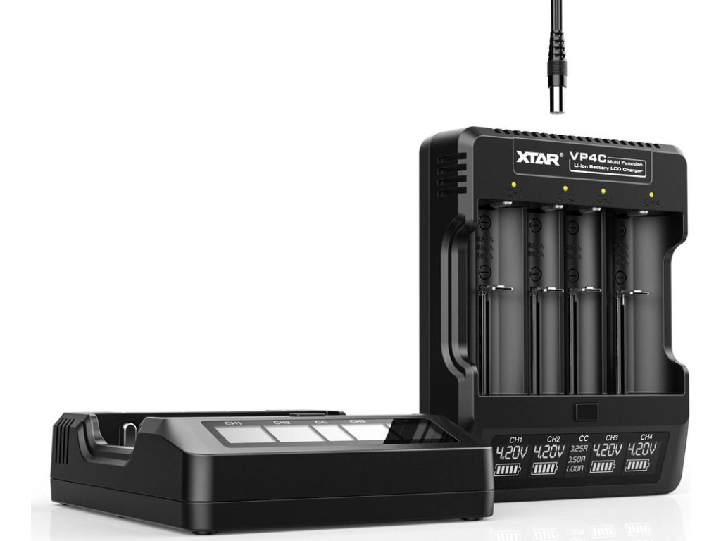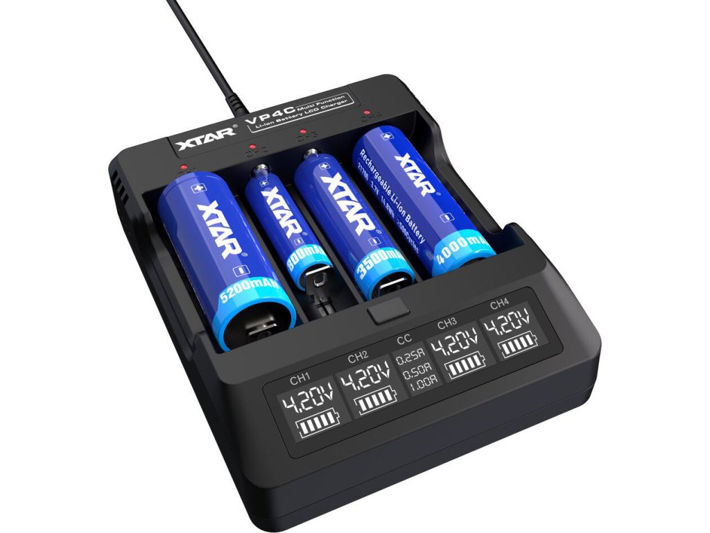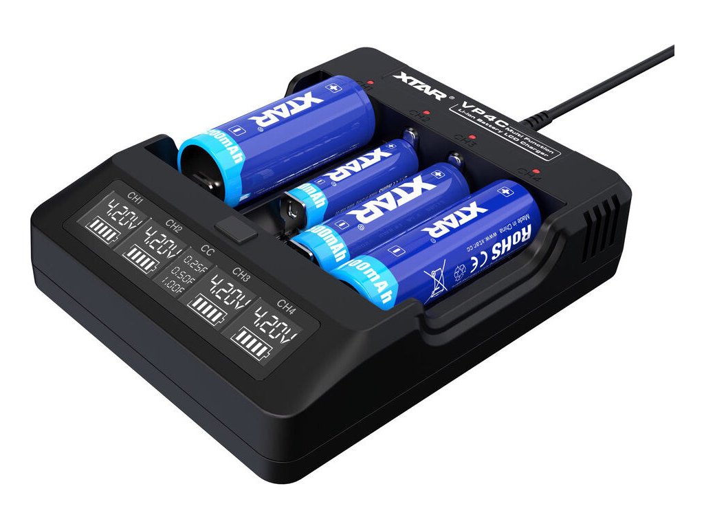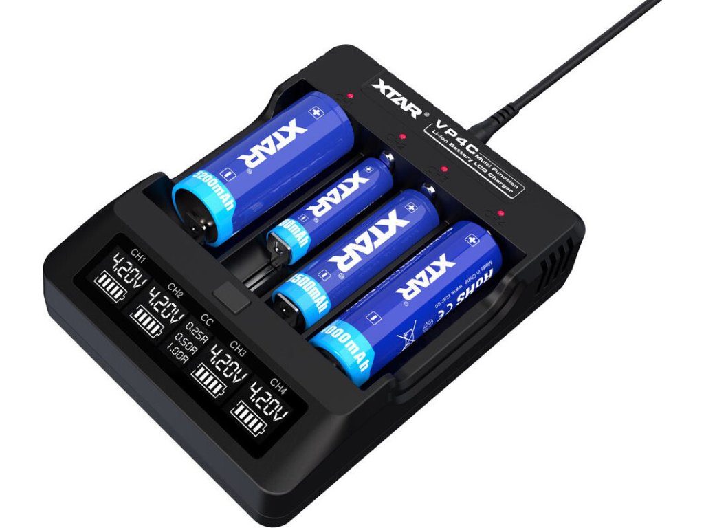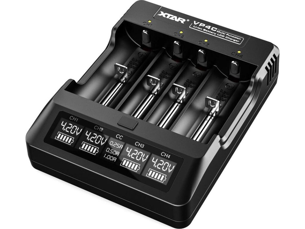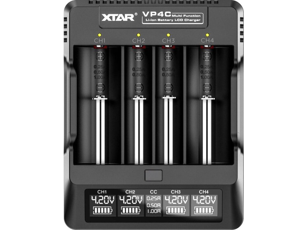 Profesionální procesorová nabíječka s třístupňovým nabíjecím procesem TC/CC/CV . Xtar VP4C nabíjí standardní 3,6/3,7V Li-ion články ve velikostech 10440, 14500, 14650, 16340, 17500, 17670, 18350, 18500, 18650, 18272 0, 32650 Baterie největší velikosti, tj . 22650, 26650 a 32650, lze nabíjet pouze ve dvou krajních kanálech.