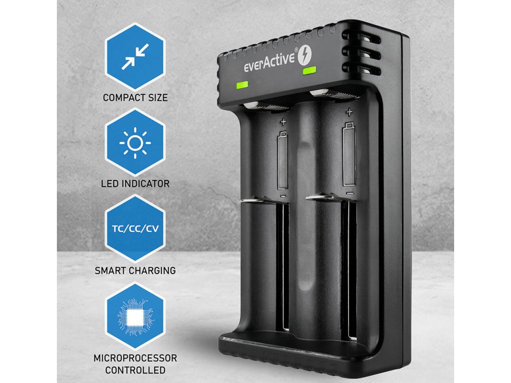 EverActive LC-200 je jednoduchá, ale vysoce spolehlivá nabíječka pro dva články/baterie. Zařízení využívá mikroprocesor k řízení procesu nabíjení. Nabíječka v tomto segmentu vyniká relativně vysokým maximálním nabíjecím proudem 1000 mA na nainstalovaný článek.