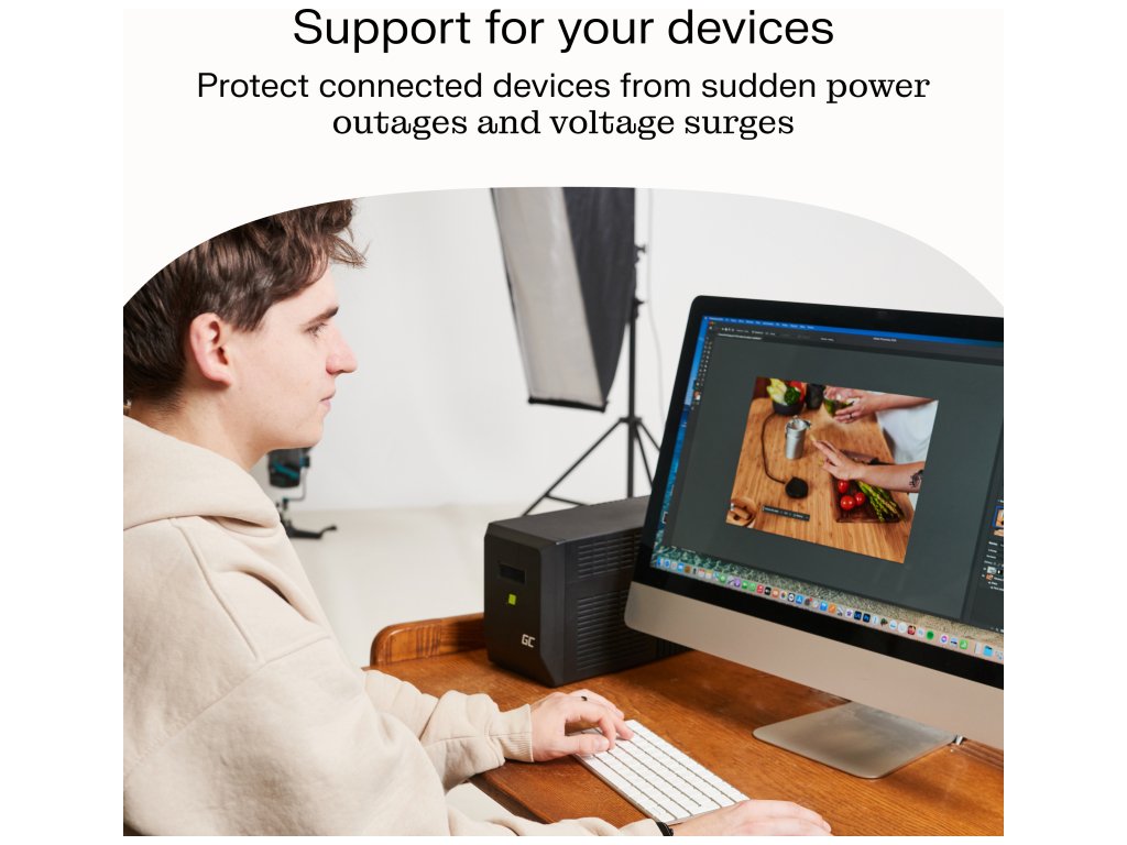 Umožňuje vám chránit připojená zařízení před výpadky napájení, a tím zachovat výsledky vaší práce a kontinuitu vašeho vybavení. Reguluje parametry výstupního proudu a zajišťuje správné napětí v případě výpadku napájení. Má vyhrazený konektor RJ45 , který ochrání váš notebook, router nebo jiná zařízení před přepětím.