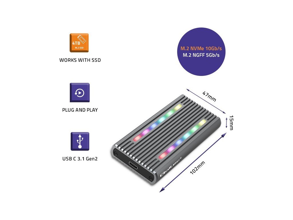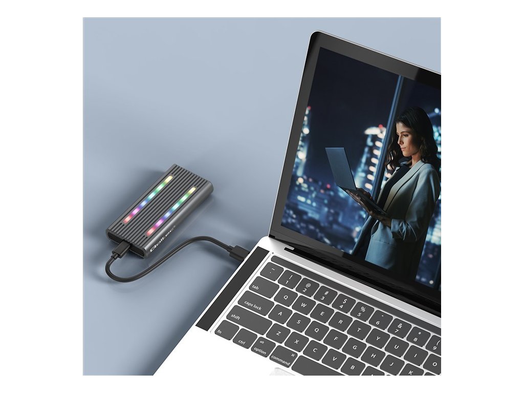 Inovativní design, bezkonkurenční funkčnost Elegantní a praktické pouzdro pro váš M.2 SSD disk je stylovou ochranou vašich cenných dat . Pouzdro je vyrobeno z kvalitního hliníku, který navíc pomáhá odvádět teplo . Kompaktní velikost pouzdra vám umožní vzít si ho s sebou do práce nebo kamkoli jinam. Odolné pouzdro poskytuje účinnou ochranu proti rozdrcení a chrání před jakýmkoli poškozením . Jedinečný design s RGB LED s možností plynulé změny barev.