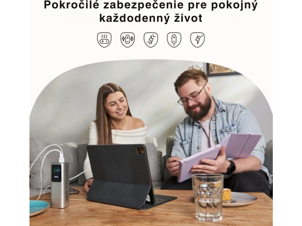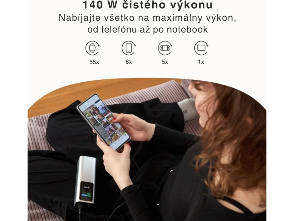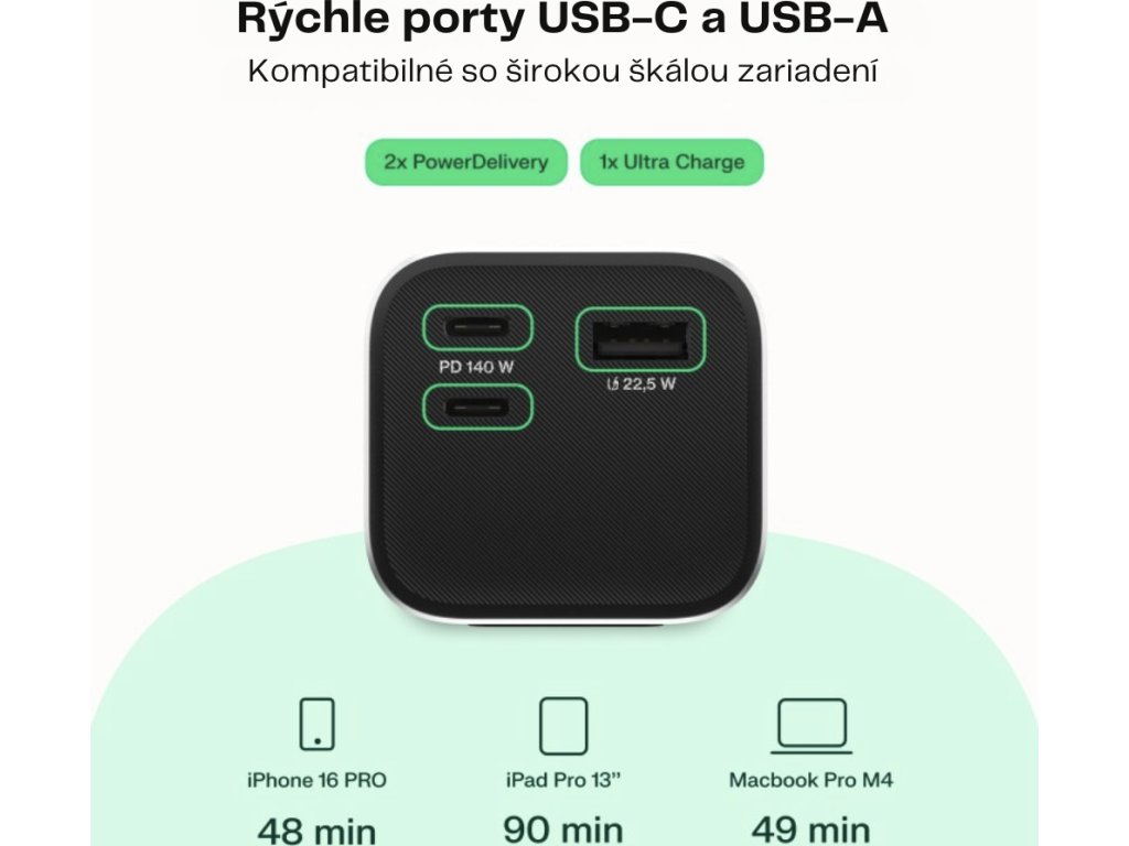 Díky čipsetu Texas Instruments podporuje nejnovější standard PD 3.1 EPR (28 V⎓5 A) tak nabiješ z 0% na 50% za cca 30 minut .