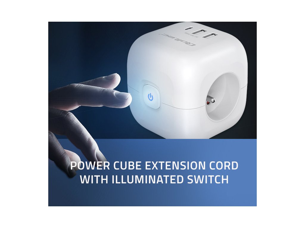 O stavu napájení informuje podsvícený vypínač s jemným modrým světlem - jedním kliknutím odpojíte celou kostku, což je nejen pohodlné, ale také energeticky úsporné . Umožňuje snadné a rychlé odpojení napájení a kompaktní krychlový tvar není jen designovým vzhledem, je především praktickým řešením, které zajišťuje výbornou organizaci prostoru.