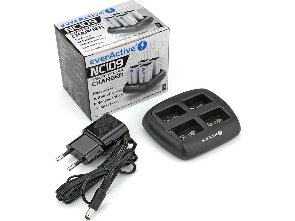 Nabíječka everActive NC 109 má unikátní, specializovaný design, který umožňuje nabíjet 1 až 4 kusy 9V Ni-MH baterií – každý článek se nabíjí samostatně .