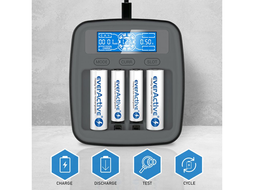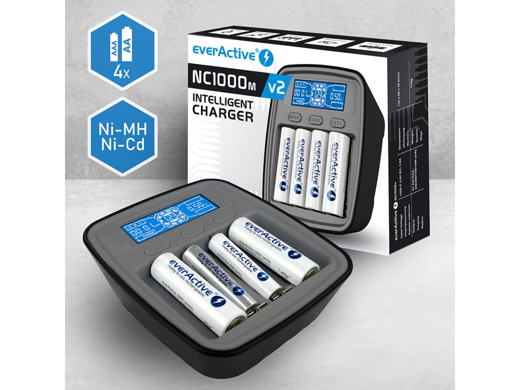 Profesionální USB-C Nabíječka everActive NC1000M v2 pro 1-4ks AA/AAA Ni-MH/Ni-Cd