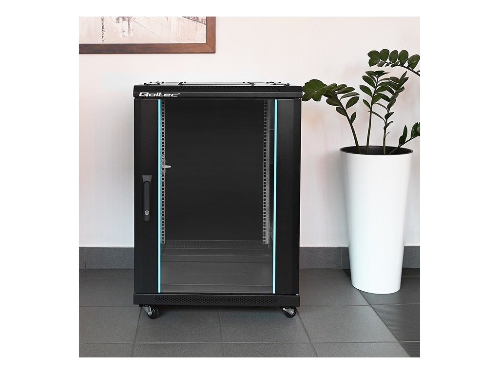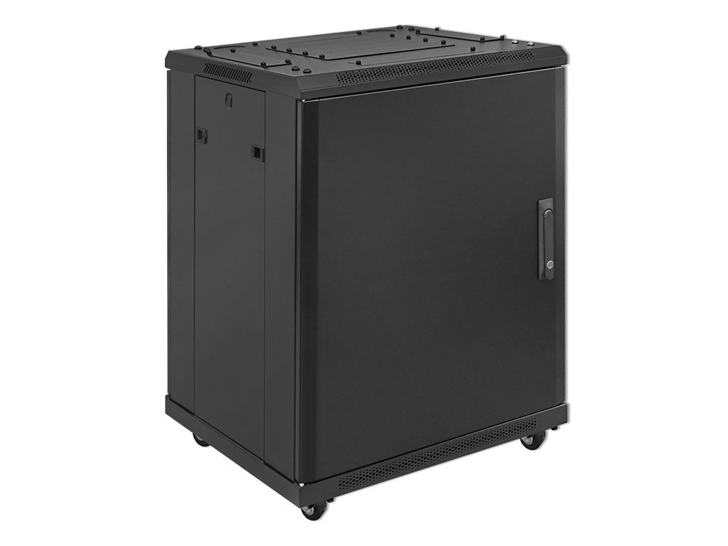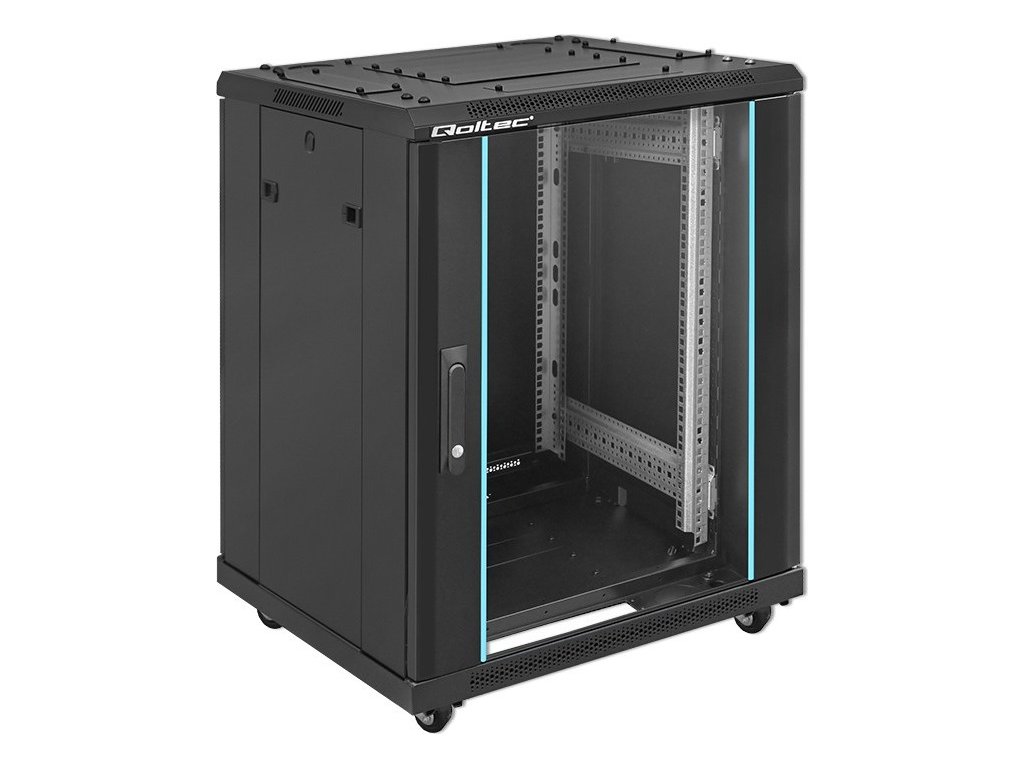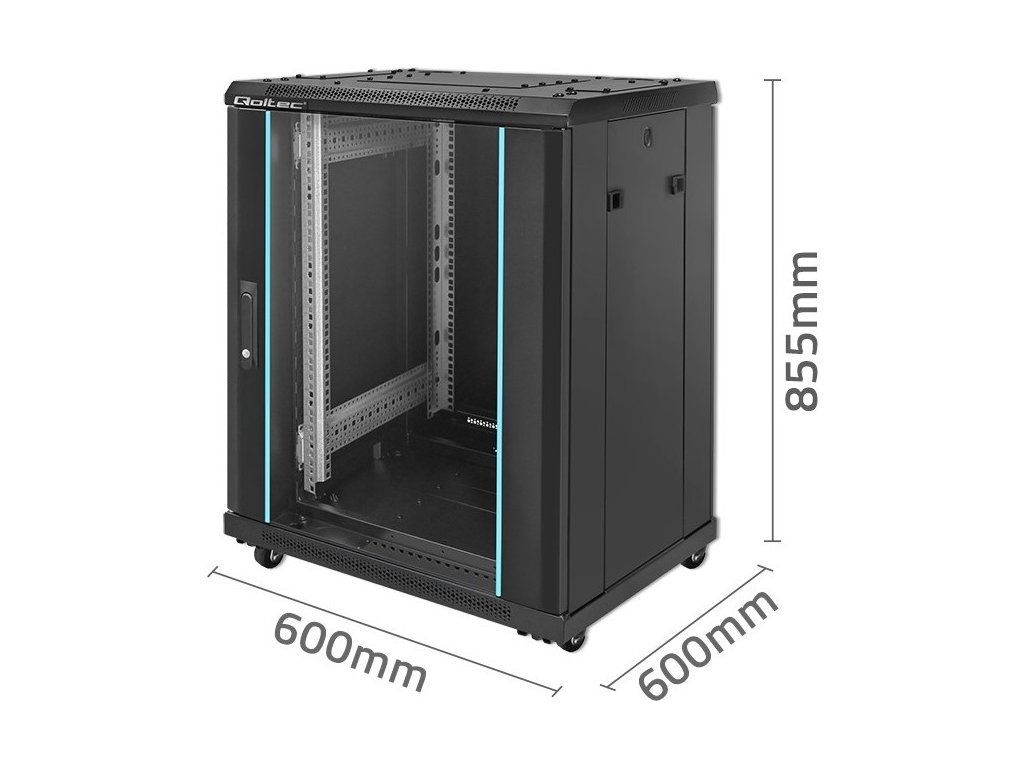 RACK Skříňka 19" | 15U | 600 x 600 x 855 | Tvrzená dvířka | Volně stojící | Nohy + kolečka | Ocelové pouzdro | Zámek