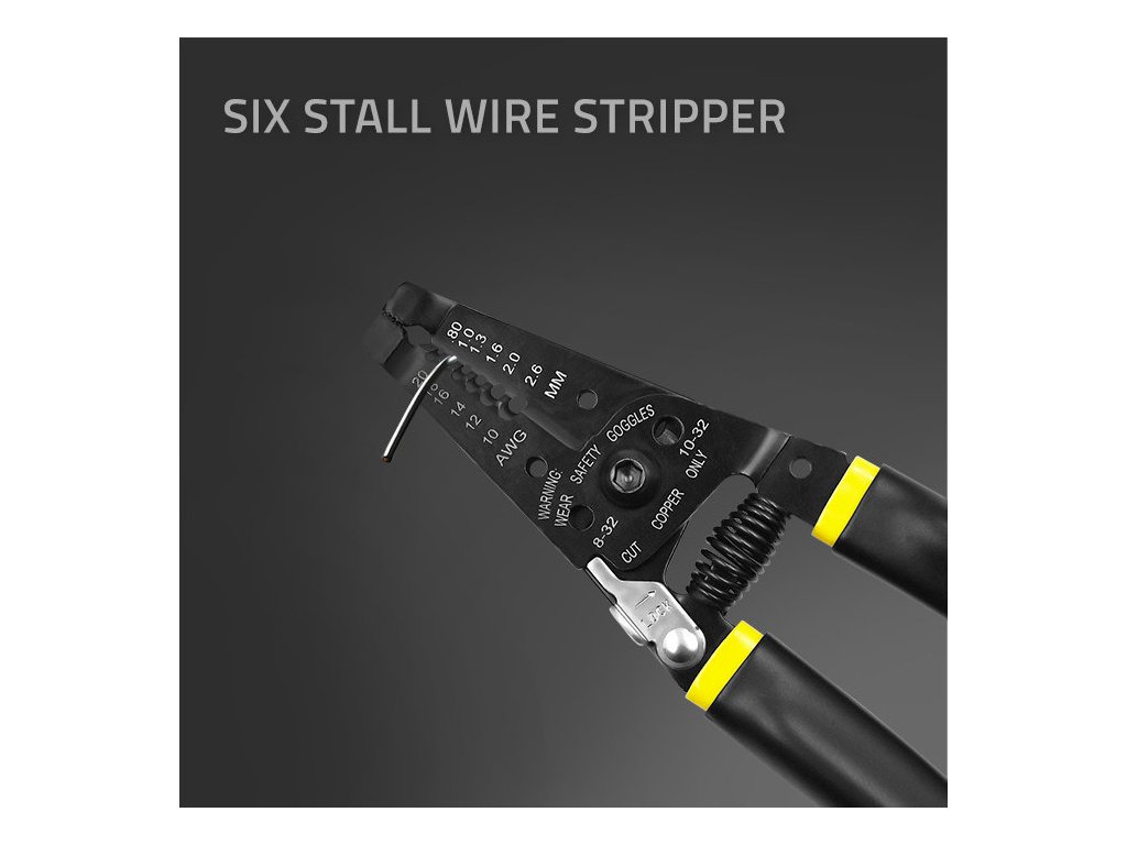 Kleště určené k odizolování jednožilových nebo vícežilových vodičů s průřezem drátu 18-10AWG a průměrem 0,9-5,5 mm² . Výrobek má speciálně označené otvory pro odstranění izolace a je vybaven nůžkami na drát a bezpečnostní pojistkou. Pohodlí při práci zajišťuje ergonomická rukojeť a odrazová pružina, která má odlehčit ruku a usnadnit práci s nářadím . Nářadí má zámek „lock“, aby se zabránilo náhodnému otevření.