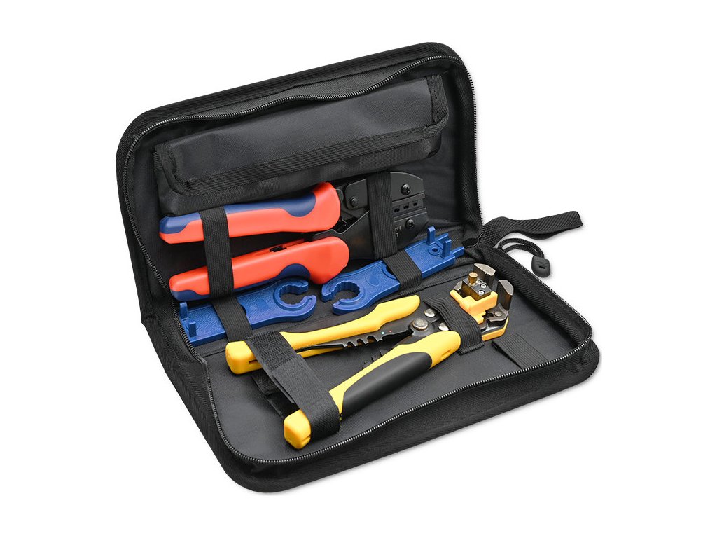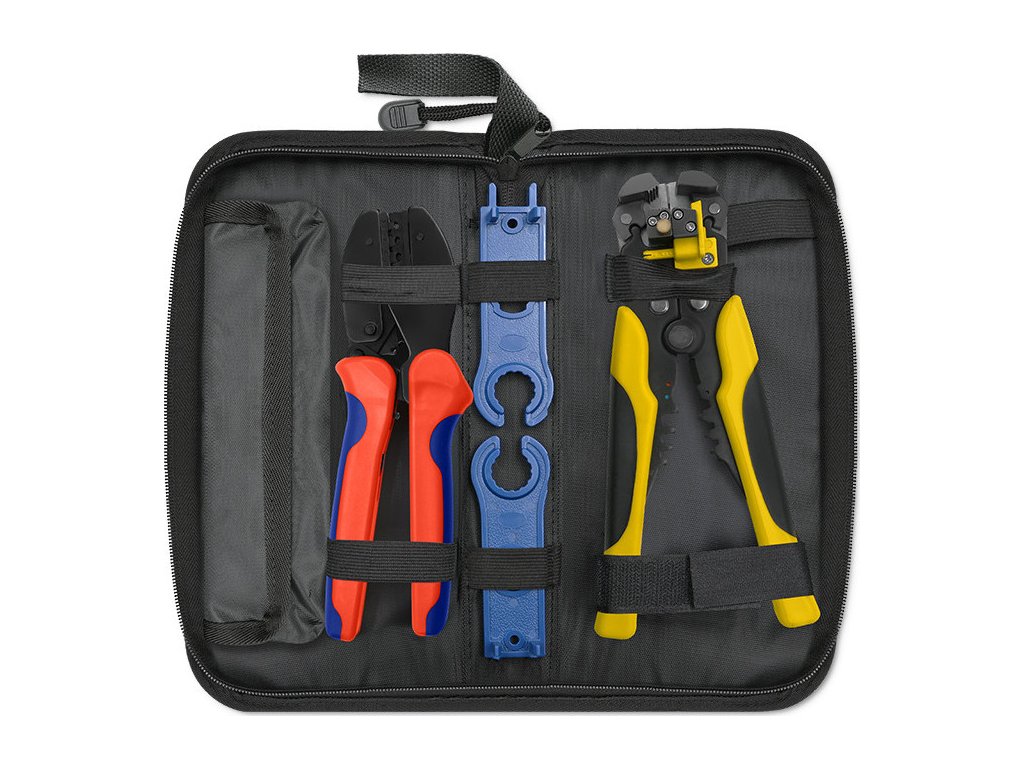 Praktický kufřík pro uskladnění solárního nářadí jistě usnadní přenášení nářadí při montáži solární instalace a ochrání před náhodnou ztrátou a mechanickým poškozením . Všechny nástroje jsou kompatibilní s konektory MC4 , což umožňuje provádět veškeré práce související s instalací solárních konektorů a propojovacích kabelů k fotovoltaické instalaci . Nyní můžete snadno odizolovat dráty nebo odříznout kabely a dráty různých průměrů.
