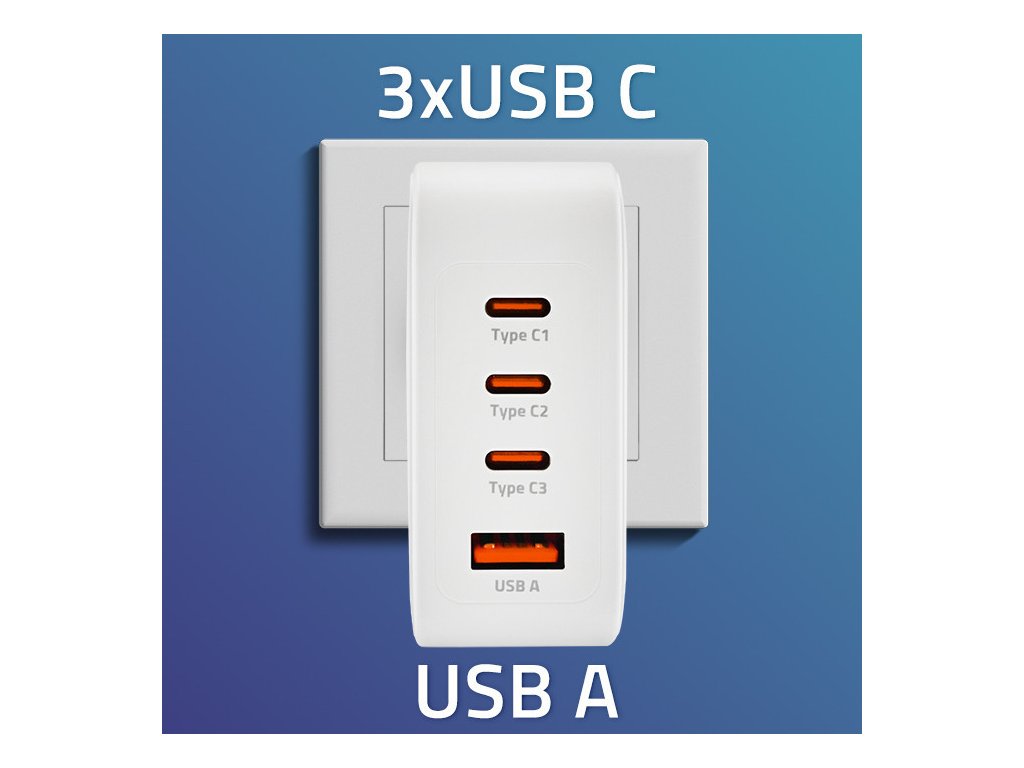 Naše nabíječka dokáže nabíjet 4 zařízení současně s přesným nastavením maximálního napětí a proudu, přizpůsobením se parametrům baterie připojeného zařízení. Toto výjimečně funkční zařízení dokáže nabít baterii na přibližně 60 % již za 30 minut . Nabíječka podporuje standard USB Type-C POWER DELIVERY a má zásuvku USB A kompatibilní s technologií Qualcomm Quick Charge 3.0 .
