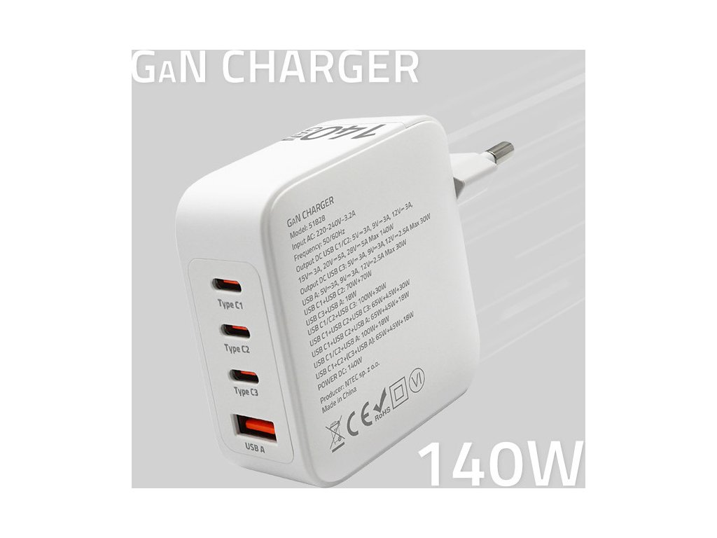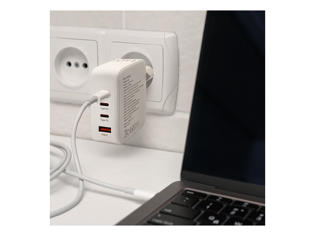 Síťová nabíječka 140W GaN | 5-20V | 2,5-5A | 3xUSB-C PD | 1xUSB QC3.0 | Přenosný počítač | Smartphone | Bílá