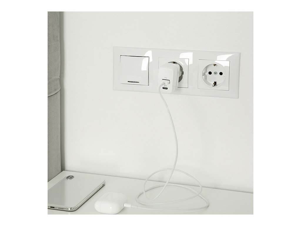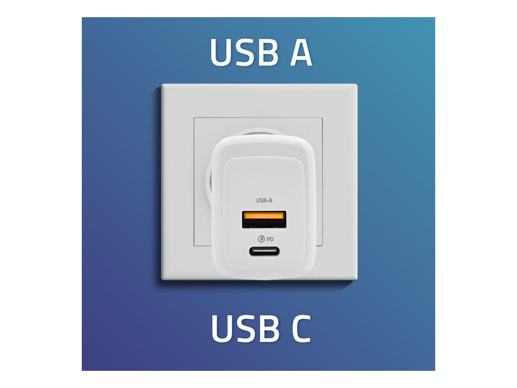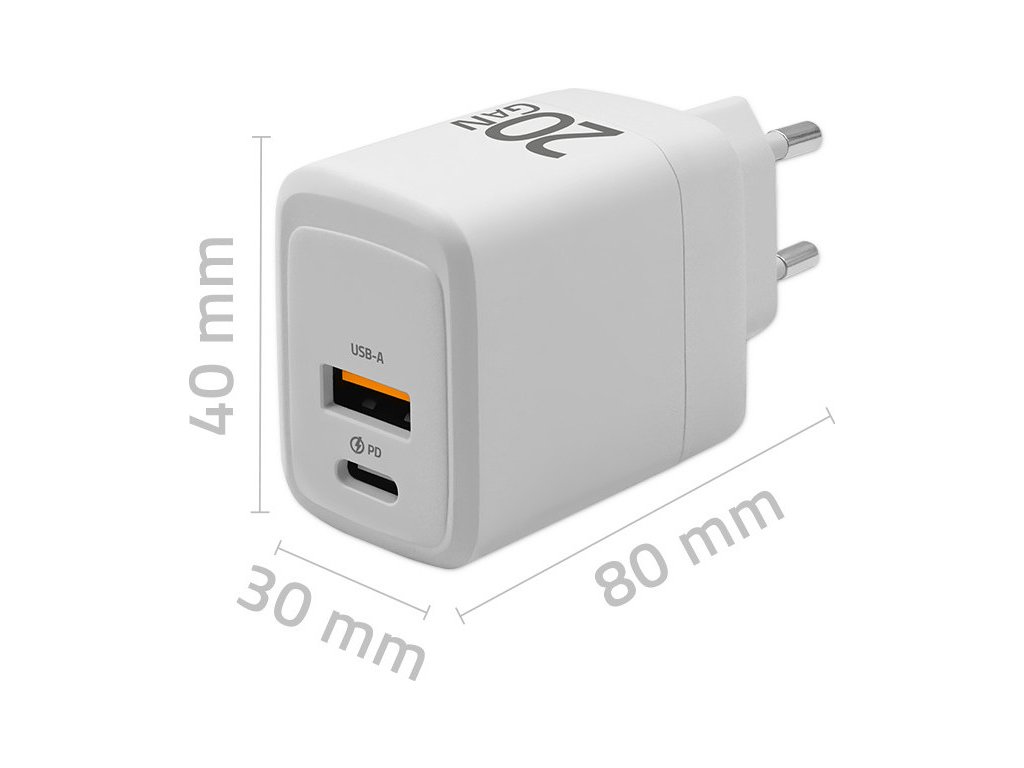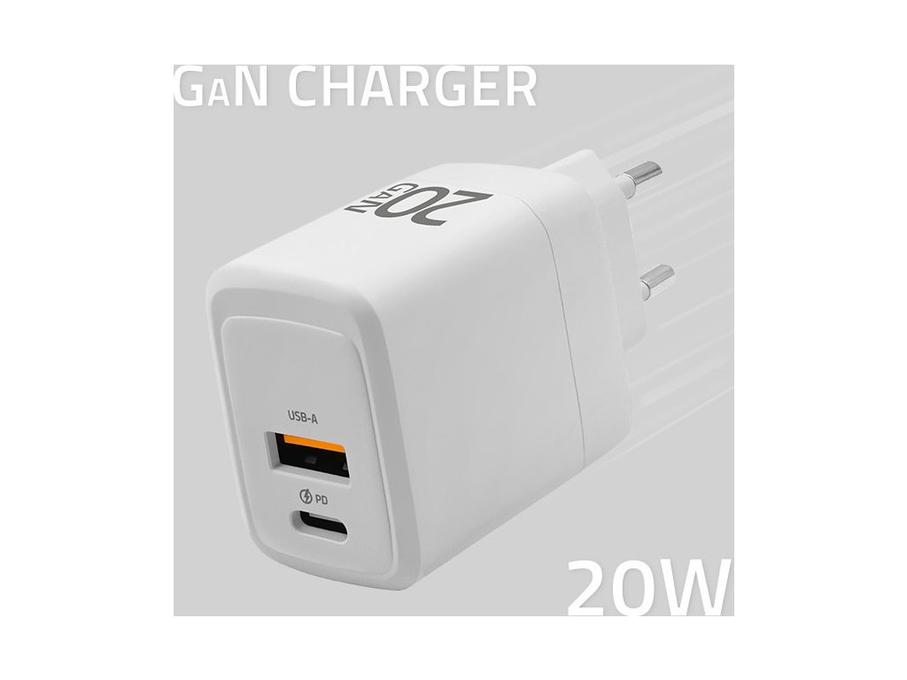 Síťová nabíječka 20WGaN | 5-20V | 1,5-3A | 1 x USB-C PD | 1 x USB QC 3.0 | Bílá