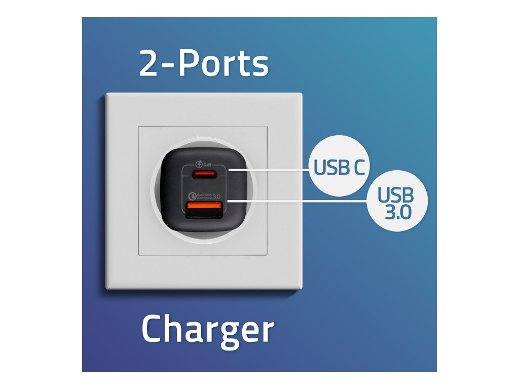 Naše nabíječka dokáže nabíjet 2 zařízení současně , přičemž přesně nastaví maximální napětí a proud, přizpůsobí se parametrům baterie připojeného zařízení. Toto výjimečně funkční zařízení dokáže nabít baterii na přibližně 60% již za 30 minut . Nabíječka podporuje standard USB-C POWER DELIVERY a má port USB-A kompatibilní s technologií Qualcomm Quick Charge 3.0 .