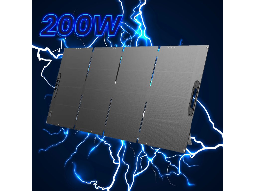 Robustní stojan na zadní straně umožňuje naklonění panelu o 45 stupňů, čímž je panel umístěn v optimálním úhlu vůči slunci. Souprava skládacích solárních panelů o výkonu 200W, vyrobená ke kempování a dobrodružství na místech bez napájení ze sítě, je ideální na dlouhé cesty, kdy vaše nabíjecí stanice potřebuje energii.