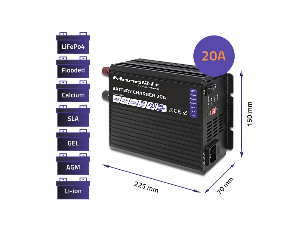 Naše nabíječka Monolith byla navržena tak, aby bezproblémově fungovala s širokou škálou různých typů baterií včetně LiFePO4, AGM, GEL, SLA, což jim poskytuje stabilní a bezpečný zdroj energie a záruku, že baterie zůstane v dobrém stavu po celou dobu provozu.