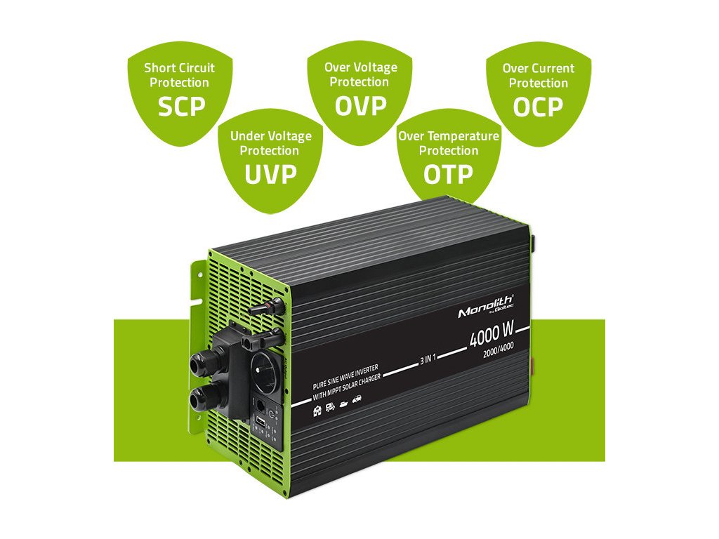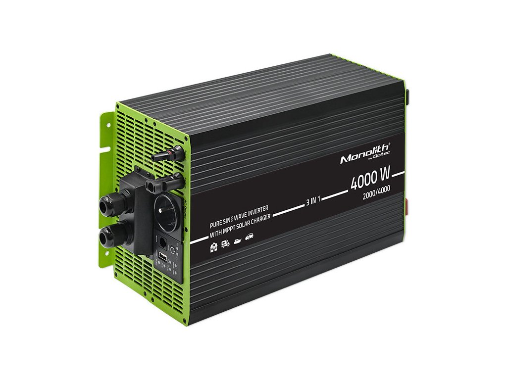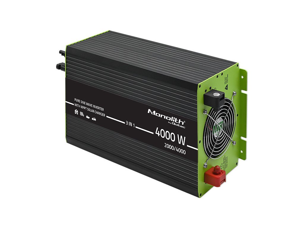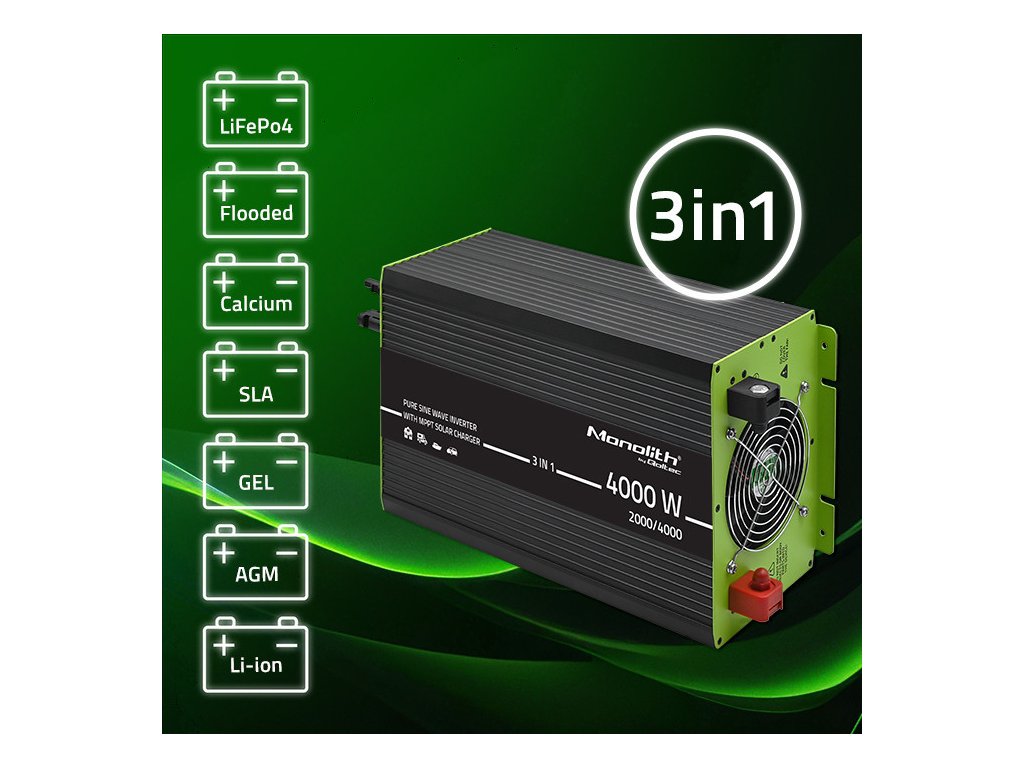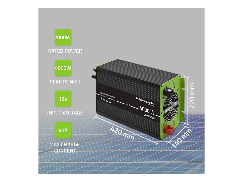 Solární měnič Monolith 3v1 s funkcí AC nabíjení | MPPT | UPS | ATS | 2000W | 4000W | 12V až 230V | Čistá síně