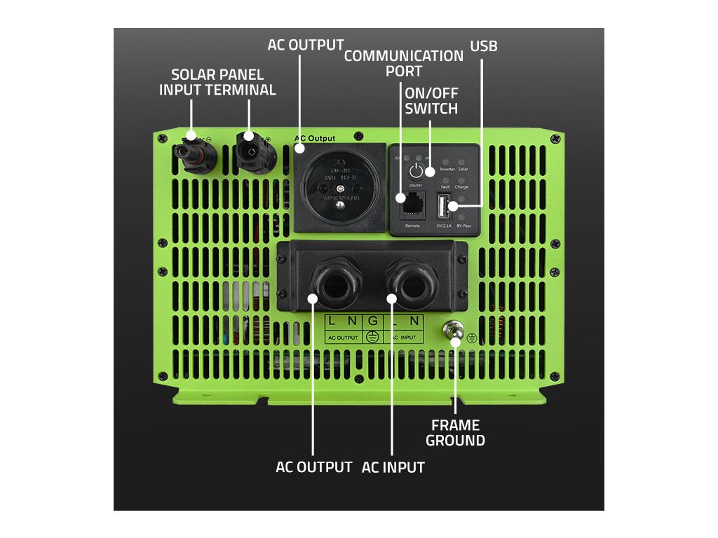 Měnič s funkcemi AC nabíjení a MPPT solárního nabíjení zajišťuje optimální výkon jak ve spojení s elektrickou sítí, tak i solárními panely. Technologie MPPT zaručuje vysokou účinnost 97%, maximalizuje produkci energie ze solárních panelů. Díky zabudovanému systému ATS se zařízení automaticky přepíná mezi síťovým napájením a solární energií, čímž je zajištěna nepřerušovaná dodávka energie .