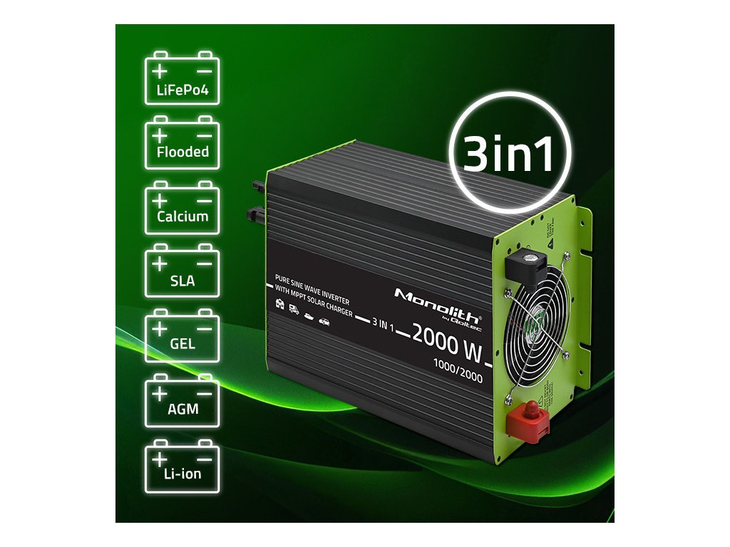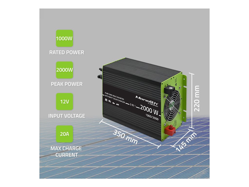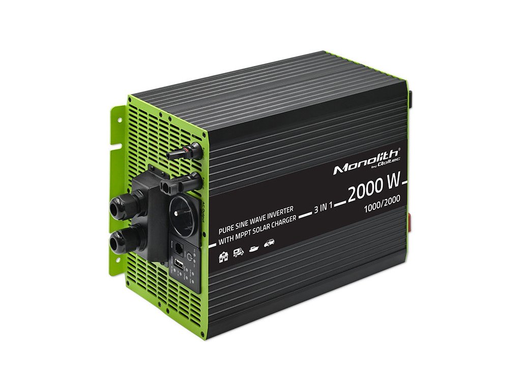 Solární měnič Monolith 3v1 s funkcí nabíjení AC 10A | MPPT 40A | UPS | ATS | 1000W | 2000W | 12V až 230V | Čistý sinus