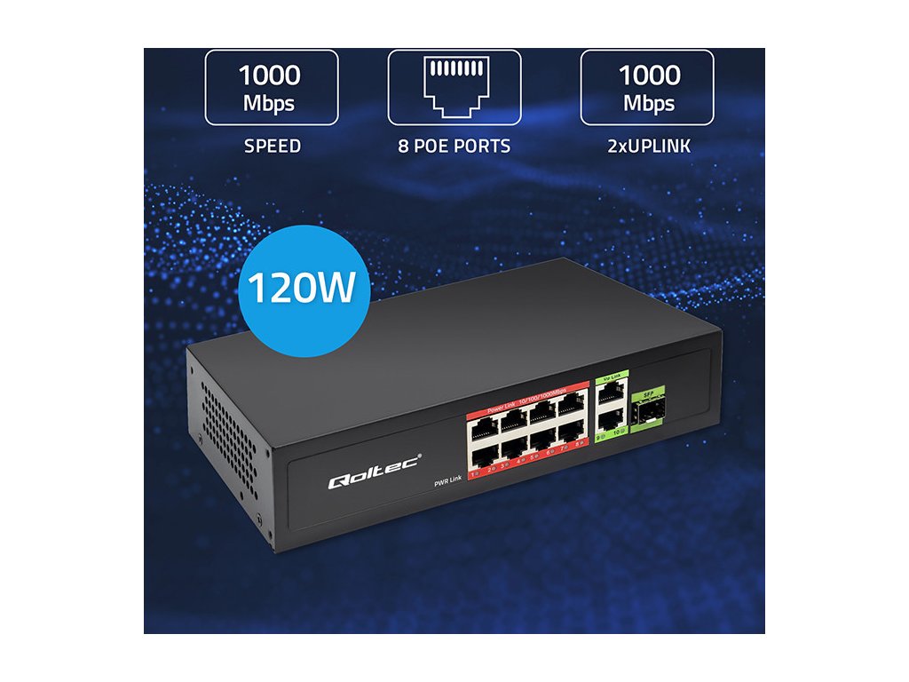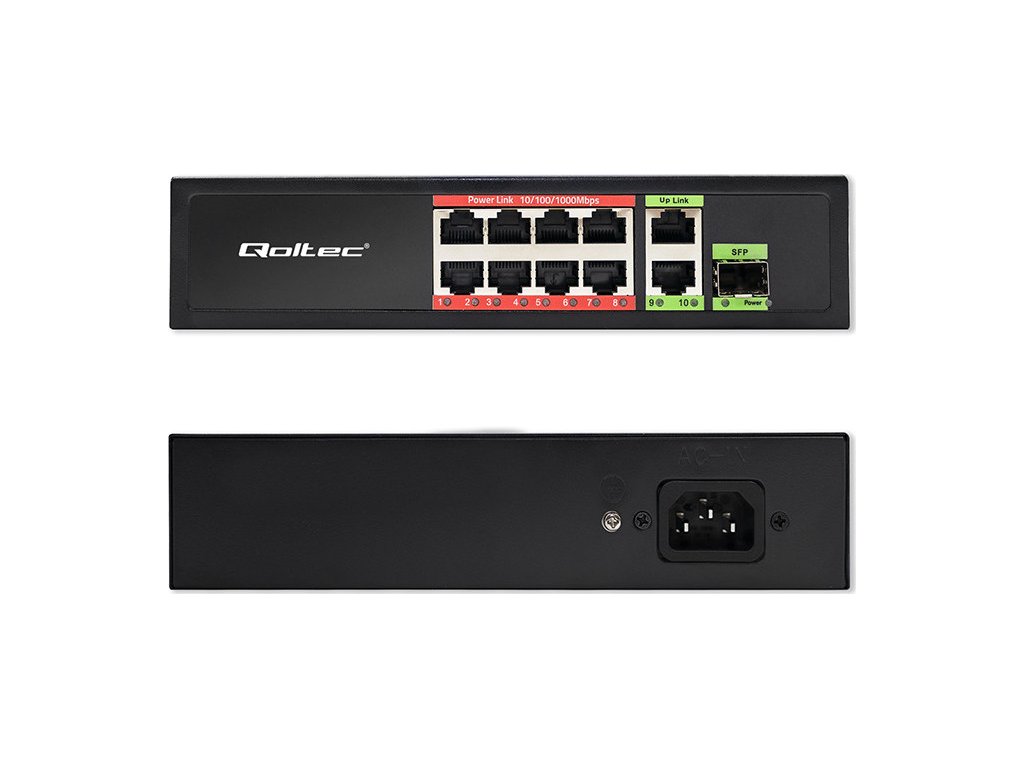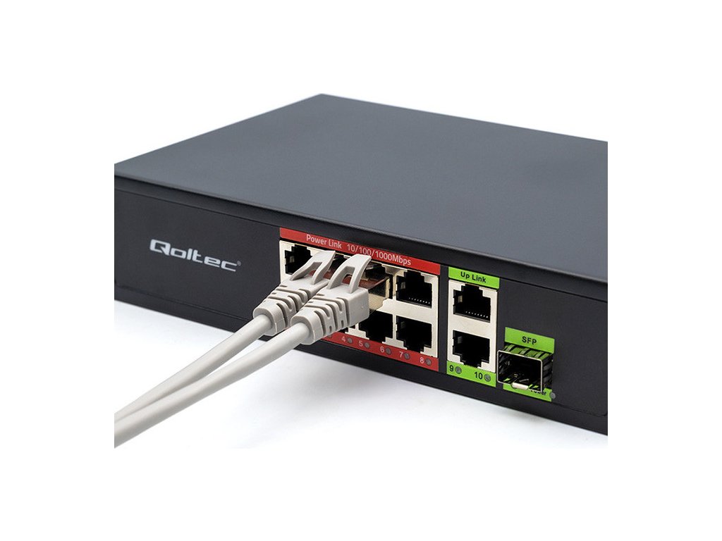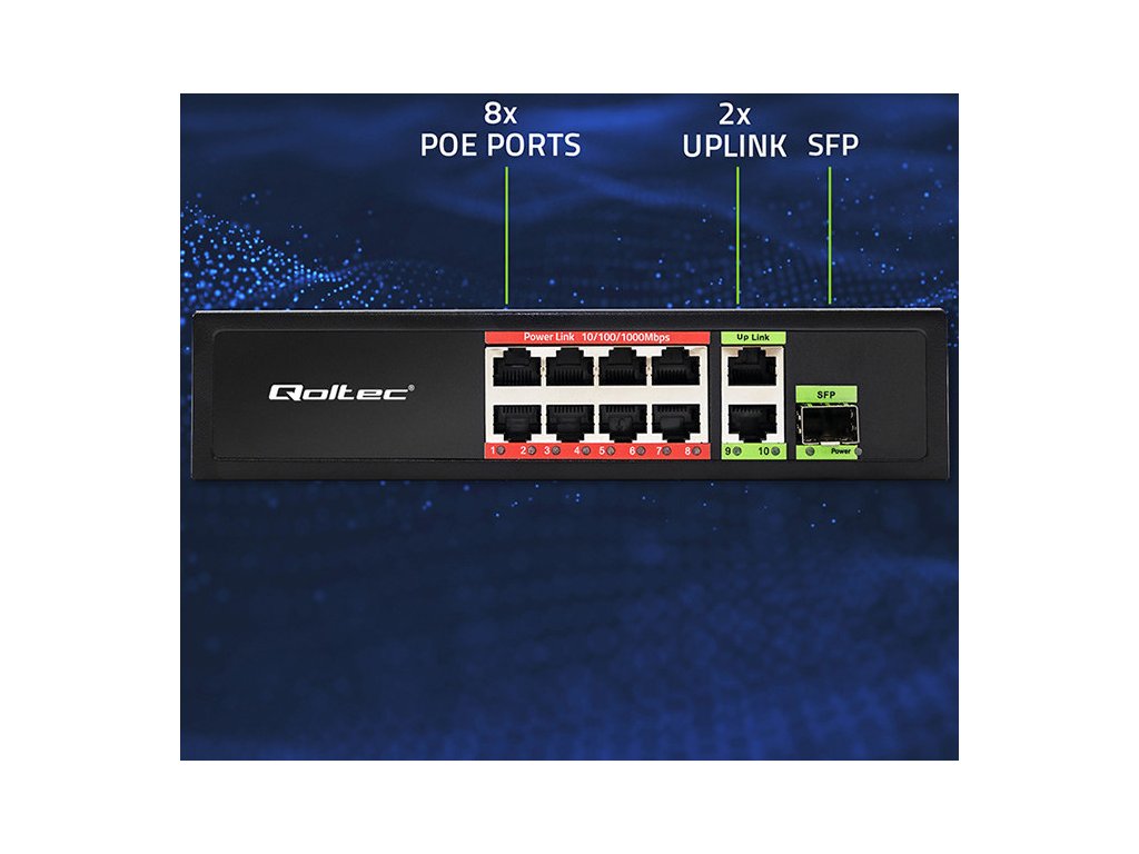 SWITCH Rychlý ethernetový PoE síťový přepínač 8x RJ45 PoE 2x RJ45 Uplink 1x SFP Qoltec | 120 W | 1000 MB