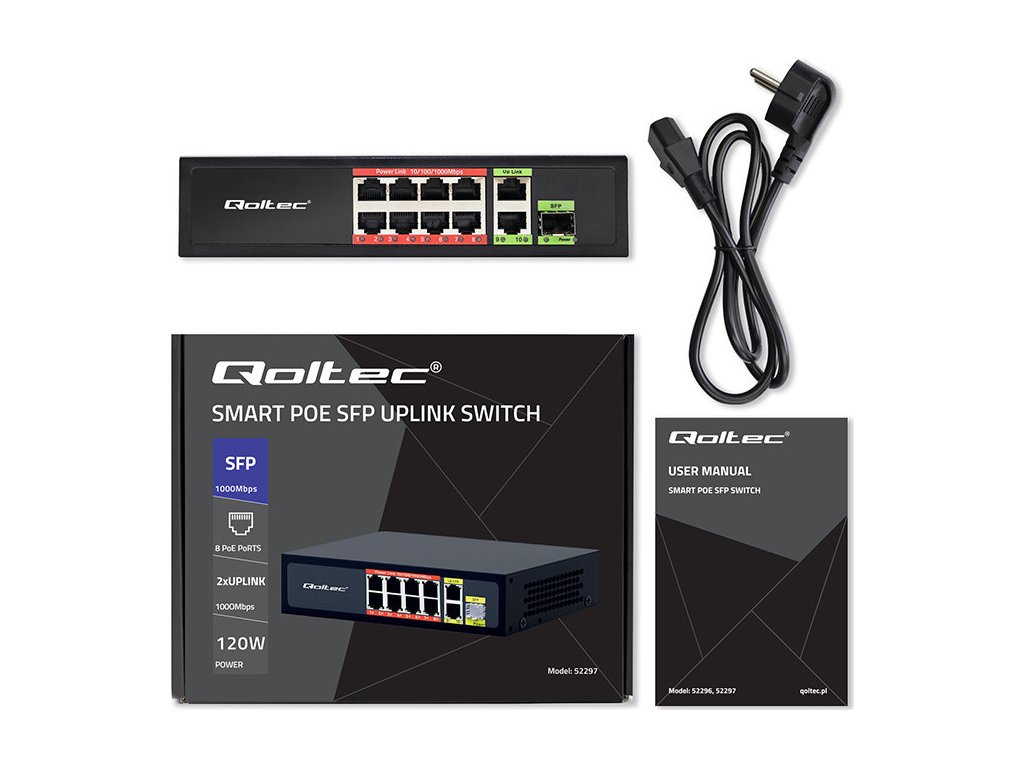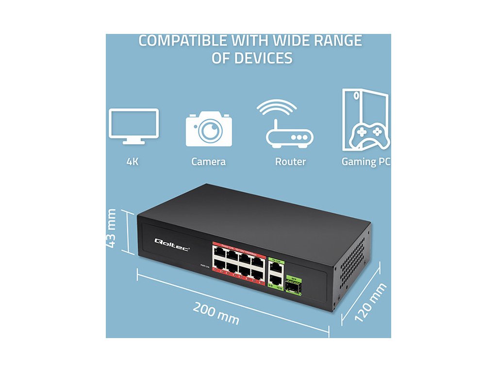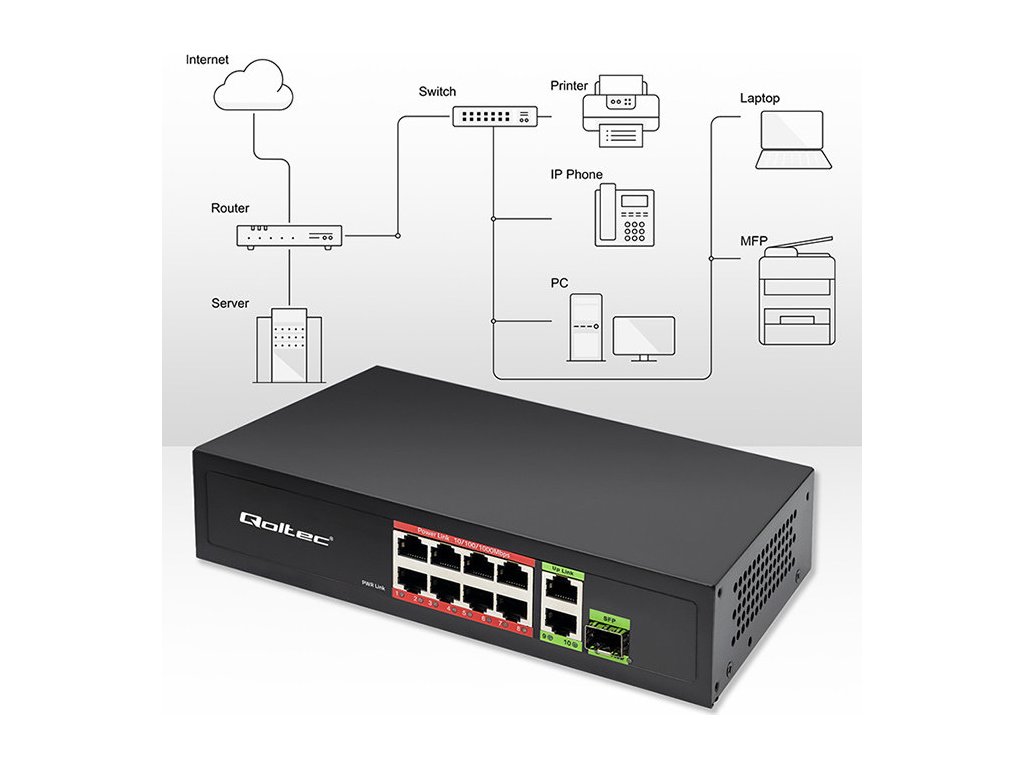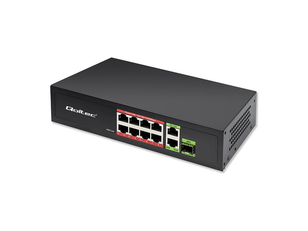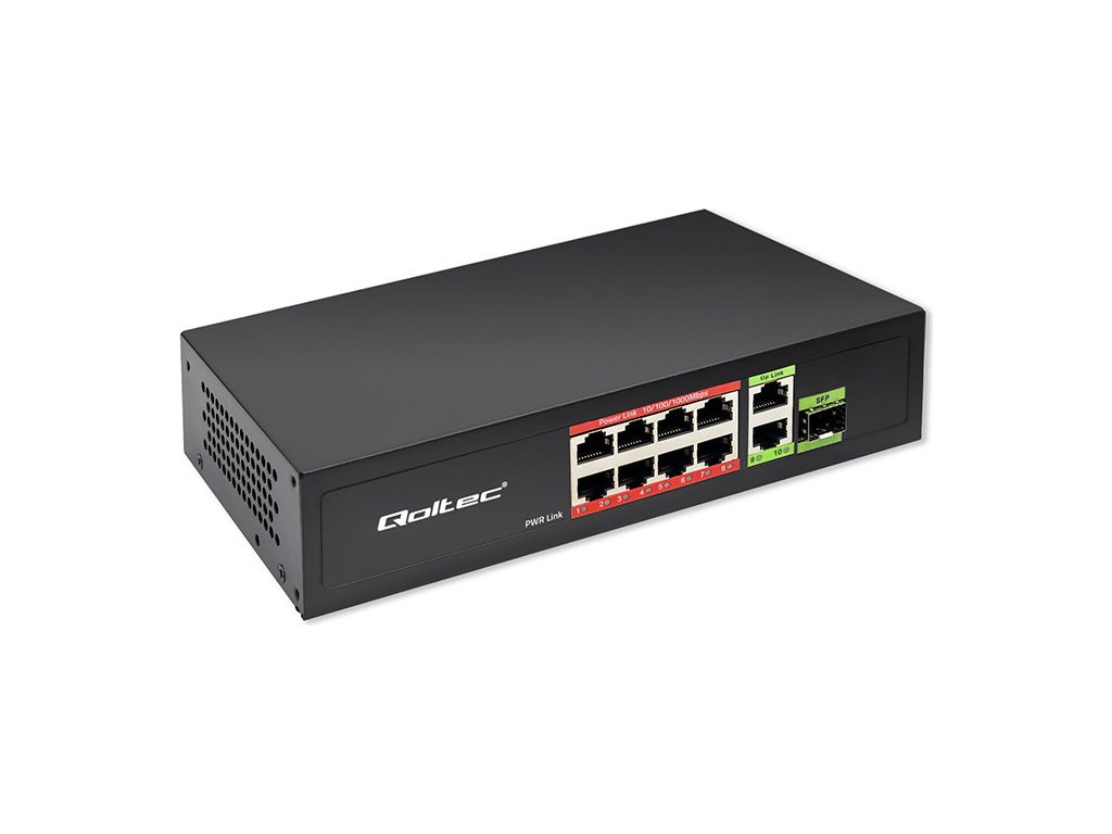 SWITCH Rychlý ethernetový PoE síťový přepínač 8x RJ45 PoE 2x RJ45 Uplink 1x SFP Qoltec | 120 W | 1000 MB