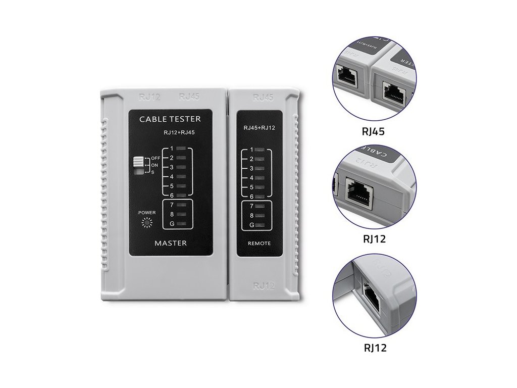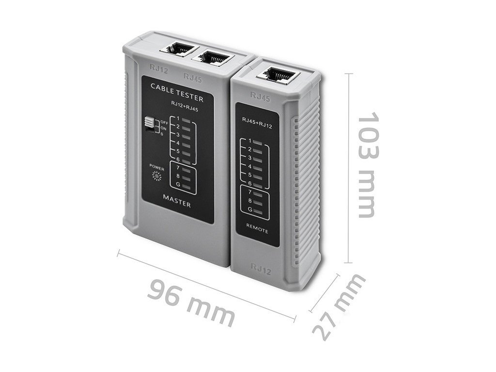 Obsah balení: | 1 x tester kabelové sítě RJ45 RJ12 |