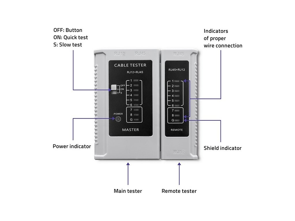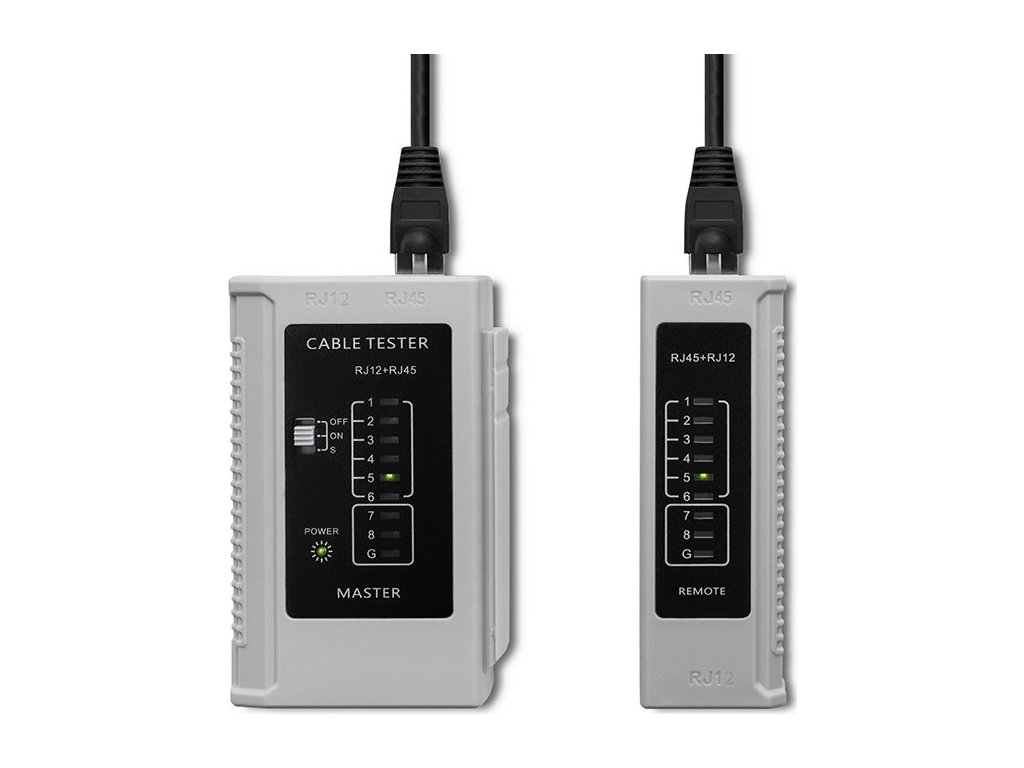 Identifikace vodičů a konektorů je jednou z klíčových aplikací testeru kabelové sítě. Zařízení eliminuje riziko chyb v konfiguraci a umožňuje ověřit správné připojení síťových kabelů zakončených konektory RJ45 a RJ12 . Díky funkci identifikace vodičů vám tester umožňuje rychle určit, který řidič odpovídá konkrétnímu konektoru nebo kolíku . Signální diody ukazují správné připojení a stav testeru kabelové sítě. Souprava obsahuje hlavní modul, který je vybaven zásuvkami RJ45 a RJ11 a zakončovač, který má diody a zásuvky RJ45 a RJ12.