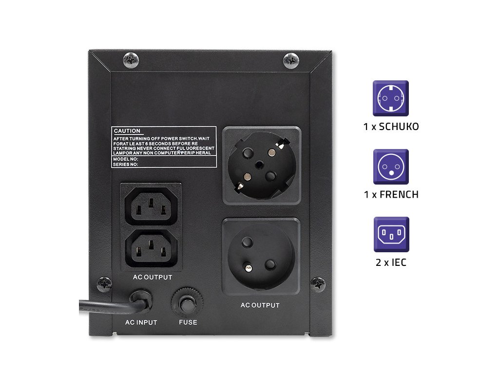 Výstupní zásuvky: | 1 x Francouzská (typ E CEE 7/5), 1 x SCHUKO (typ F CEE 7/3), 2 x IEC (IEC 320 C13) |
