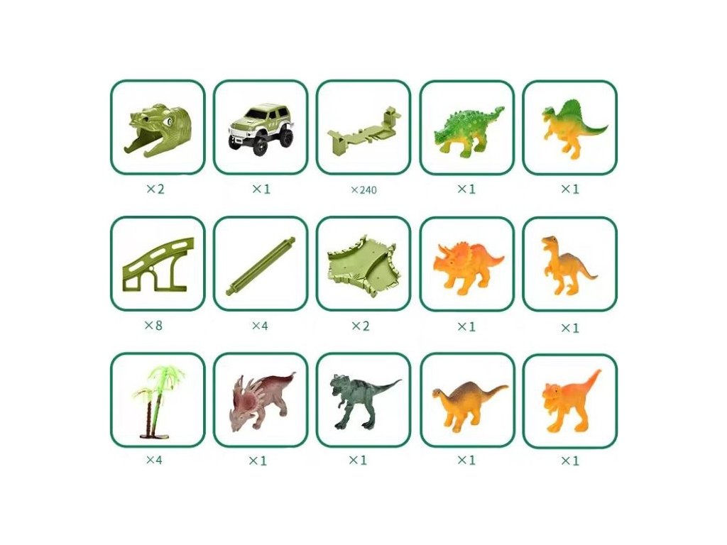 Sada se skládá z mnoha prvků, jako jsou figurky dinosaurů, palmy, mosty, serpentiny a tunely, které obohacují zábavu. Díky takovému bohatému obsahu si vaše dítě bude moci volně konfigurovat trasu a přesunout se do skutečného dinoparku. Je to skvělá příležitost k rozvoji fantazie a stavebních dovedností.