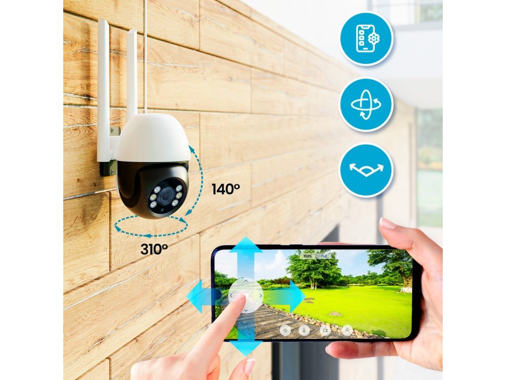 V aplikaci lze ovládat horizontální rotaci 310°, vertikální rotaci 140° a 5x digitální zoom. S pozorovacím úhlem 145 stupňů zaručuje PTZ kamera široký rozsah monitorovací oblasti.
