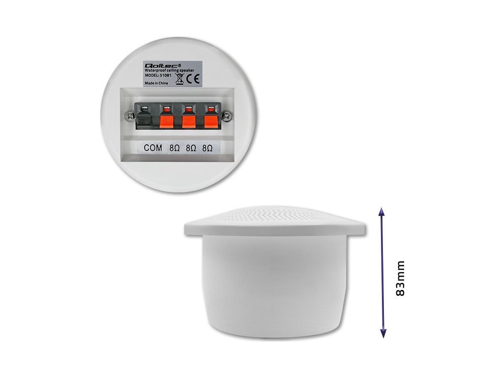 Vodotěsný stropní reproduktor Qoltec o průměru 3'' poskytuje čistý a čistý zvuk díky RMS rovným 2W. Bílá barva reproduktoru usnadňuje jeho integraci do místa instalace, například do podhledu nebo sádrokartonu, čímž dodává místnosti eleganci . Jeho design také umožňuje použití jako ozvučení v prostředí s vysokou vlhkostí , například v kuchyni nebo koupelně. Tento produkt perfektně poslouží jako prvek zvukového systému doma, v kanceláři i v rádiových sítích.