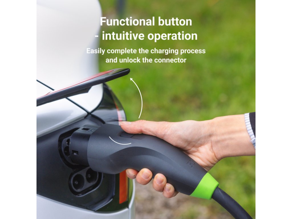 Má kabel se standardní zástrčkou typu 2, což zajišťuje širokou kompatibilitu s elektrickými vozidly v celé Evropě.