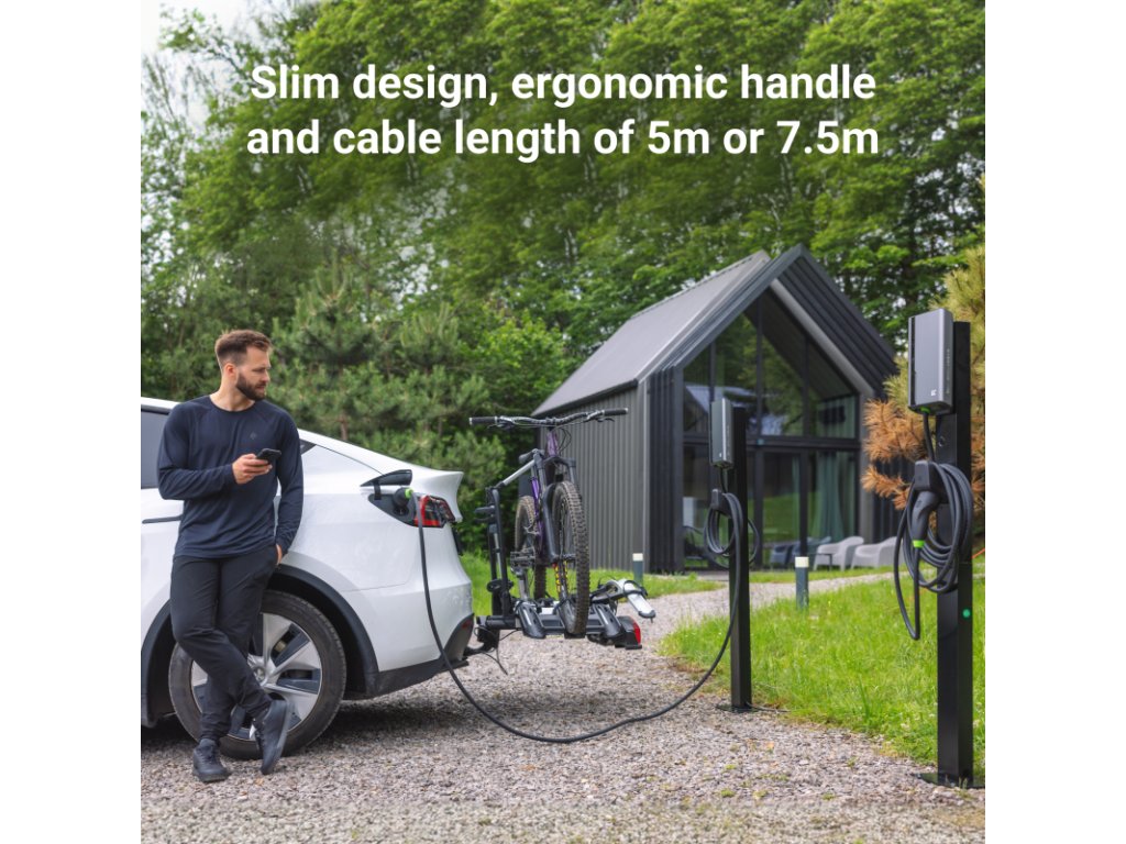 Kromě toho je HabuDen dostupný ve dvou verzích s kabelem 5 m nebo 7.5 m . 5metrová verze je pohodlná, lehčí a ideální pro situace, kdy je vzdálenost od zásuvky k autu vždy stejná. 7.5metrový kabel vám poskytuje plnou flexibilitu při připojování bez ohledu na velikost auta, způsob parkování a umístění stanice. Je ideální i pro dvojgaráže.